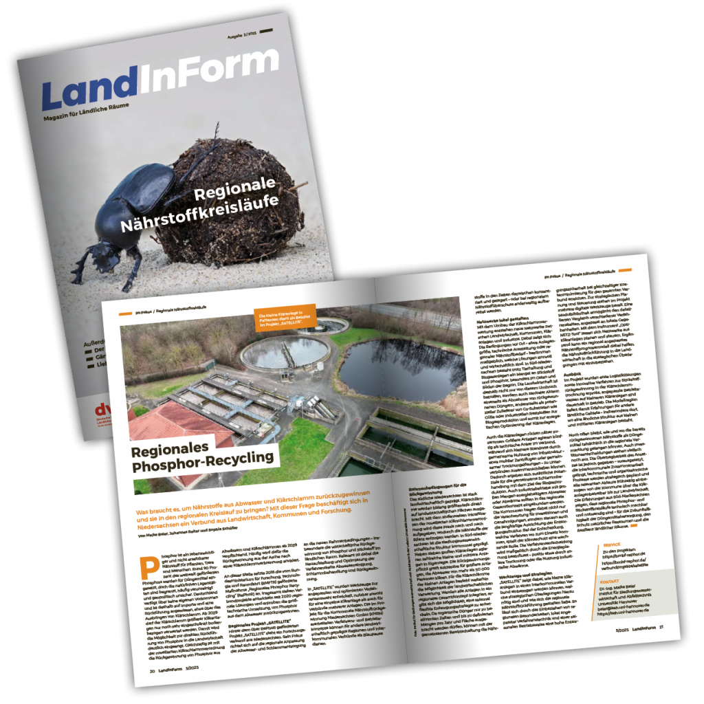 In der aktuellen Ausgabe von LandInForm ist ein Beitrag von SATELLITE und TransPhoR zum Nährstoffrecycling von Phosphor erschienen. Am Beispiel aus Niedersachsen zeigt der Artikel, welche Schritte nötig sind, um Phosphor aus Abwasser und Klärschlamm zurückzugewinnen und wieder in regionale Kreisläufe zu bringen, von den Rahmenbedingungen bis zur Rolle von Kommunen, Landwirtschaft und Forschung vor Ort.